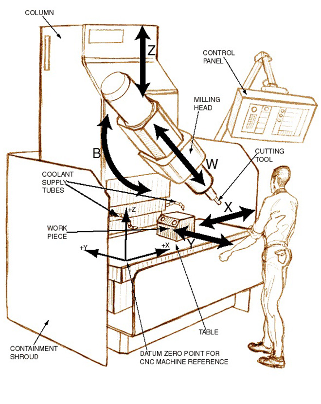 La fresatura CNC è spesso raggruppata per numero di assi, da 3 a 5 assi. Ogni asse è etichettato con una lettera specifica. Ad esempio, gli assi X e Y rappresentano il movimento orizzontale del mulino' s pezzo in lavorazione. L'asse Z indica il movimento verticale e l'asse W rappresenta il movimento diagonale attraverso il piano verticale.